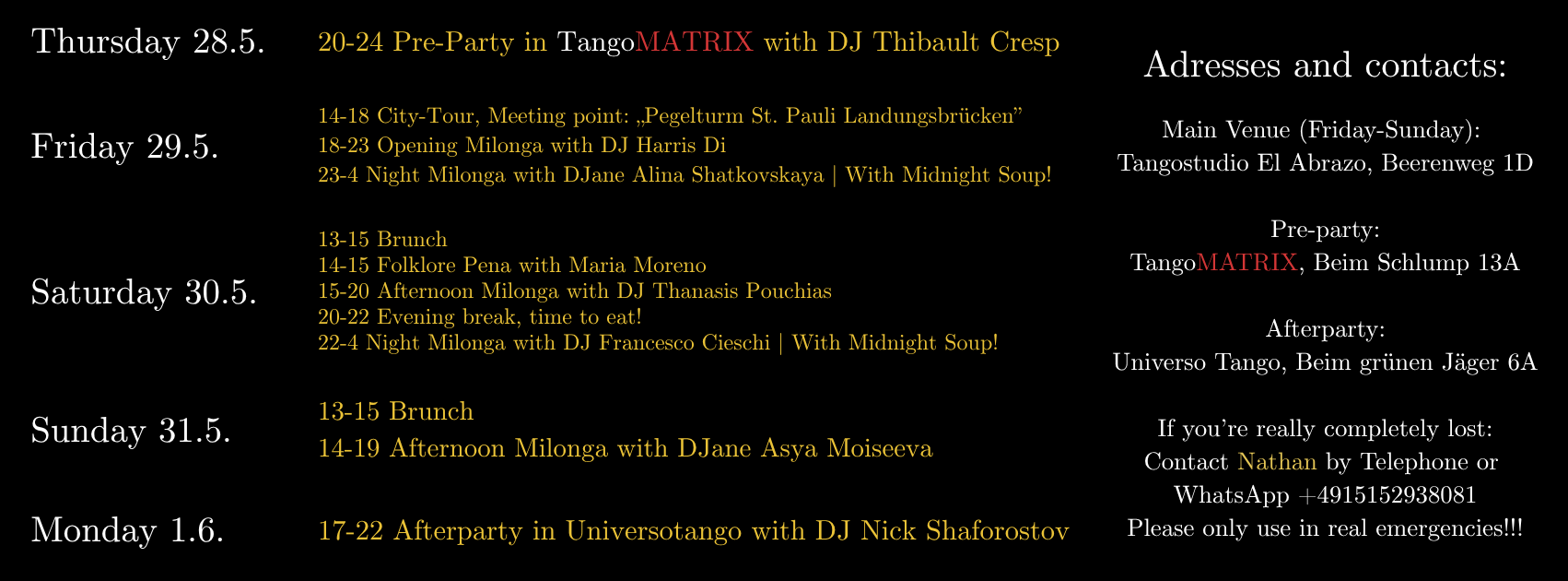 A: We try to mix a relatively homogenous group of dancers to create an event that everybody enjoys. We will accept a maximum of 25% local dancers, 25% from other german cities and at least 50% international guests. Our main criteria for selection is whether or not we feel like you contribute to a good mood for the event. A certain dance level is important too, so that people won't feel too hesitant to use mirada, but you don't have to be a professional dancer!